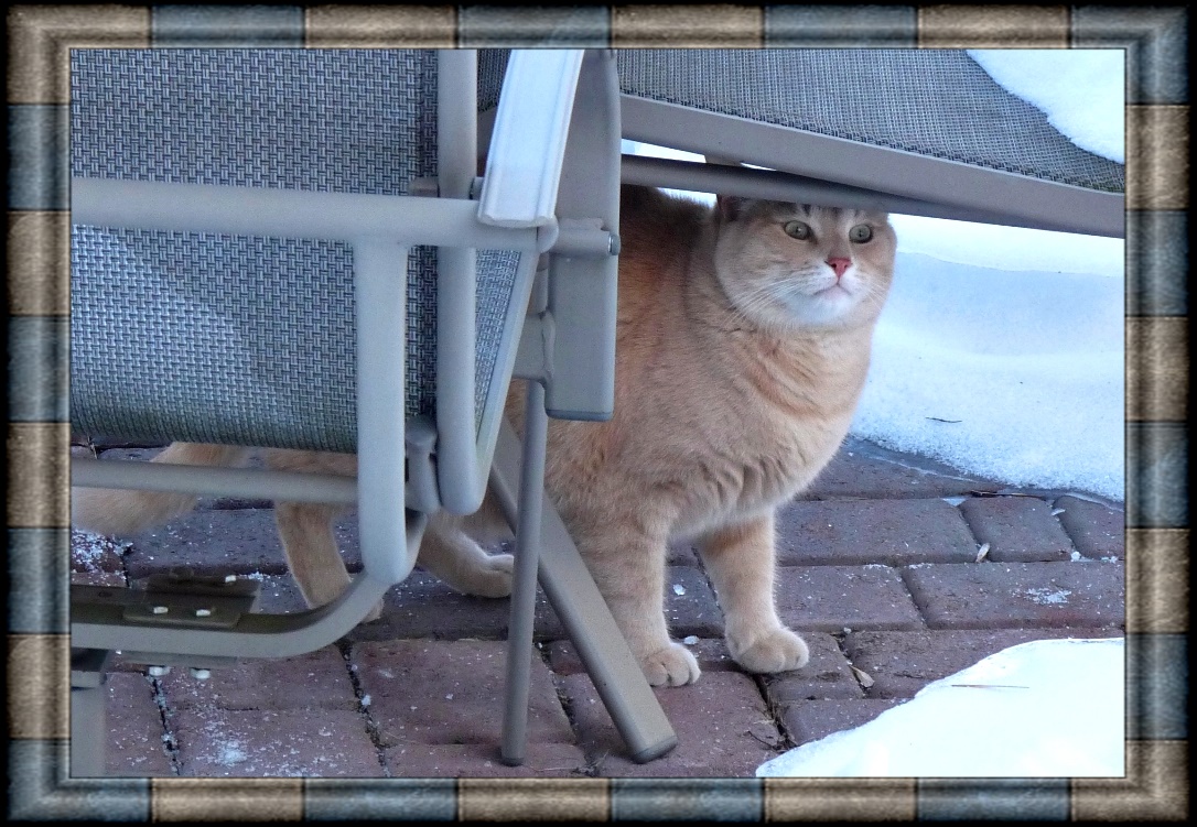 Here's Dylan outside in the snow taking shelter under a lawn chair.